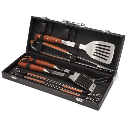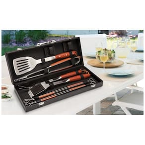O conjunto inclui espátula do chef, pinças para grelhar, garfo do chef, conjunto de 4 espetos, escova para grelhar, 2 cabeças de reposição Estojo de couro incluído perfeito para zenamento e viagem Construção de aço inoxidável forjado Alças de madeira de pakka artesanais Qualidade da cozinha clássica Marca: Não Informado