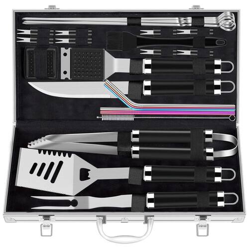 FERRAMENTAS DE CHURRASCO ESSENCIAIS OBRIGATÓRIOS Conjunto de iniciação essencial para os amantes de churrasco, este conjunto de grelha contém tudo o que você precisa para todos os seus churrascos 1 pinças de cabo longo, 1 espátula multifuncional, 1 garfo de grelha, 1 faca afiada, 1 Escova de alinhavo, 1 escova de limpeza com raspador, 1 cabeça de escova de limpeza extra, 4 espetos para churrasco, 8 suportes de milho, 1 conjuntos de palha reutilizáveis 2 palha de arco íris, 2 palha de prata, 1 escova de limpeza de palha , 1 caixa de alumínio