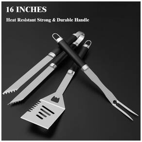 AÇO INOX DE ALTA QUALIDADE Nosso conjunto de ferramentas de grelha de 25 peças feito de aço inoxidável de nível profissional resistente à ferrugem, durável e duradouro, todas as ferramentas de churrasco são extra grossas e aguentam bem após muito uso sem dobrar ou rachar, o pinças e espátula são todos pesados, mas leves o suficiente para manusear com qualquer alimento neles, projetado com alça alongada para manter uma distância segura do fogo sem se preocupar em se queimar.