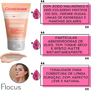 O novo cicatricure protetor solar antissinais fps 50 de uso diário com ácido hialurônico e pró-colágeno protege a pele do sol, ajudando a prevenir os sinais visíveis do foto-envelhecimento como rugas, linhas de expressão e manchas solares. Com partículas absorvedoras de oleosidade, confere toque seco e matifica a pele instantaneamente.