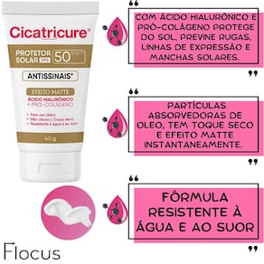 Kit cicatricure protetor solar fps50 antissinais Bem vindo a a loja flocus. É um prazer tê-lo a como nosso a cliente Anúncio variável. Escolha os itens que melhor lhe atender, porém para uma skin care perfeita, recomendamos que utilize a linha completa cicatricure, especialista no cuidado com a pele. sua exclusiva fórmula com bio-regenext ajuda a recuperar a elasticidade e a firmeza da pele, reduzindo visivelmente as rugas e linhas de expressão. Conteúdo: 1 creme facial antissinais cicatricure - 50g 1 protetor solar antissinais fps 50 toque seco cicatricure 40 g sem cor ou cor clara Cicatricure é especialista no cuidado com a pele. Uma marca parceira, com soluções eficazes e acessíveis pensadas especialmente para todos aqueles que querem cuidar da pele. Sua exclusiva fórmula com bio-regenext ajuda a recuperar a elasticidade e a firmeza da pele, reduzindo visivelmente as rugas e linhas de expressão. O creme facial cicatricure antissinais possui a tecnologia bio-regenext que transmite informações de uma célula para outra, promove a regeneração natural e repara os danos na pele proporcionando aparência mais jovem. O novo cicatricure protetor solar antissinais fps 50 de uso diário com ácido hialurônico e pró-colágeno protege a pele do sol, ajudando a prevenir os sinais visíveis do foto-envelhecimento como rugas, linhas de expressão e manchas solares. Com partículas absorvedoras de oleosidade, confere toque seco e matifica a pele instantaneamente. fórmula resistente à água e ao suor. Testado dermatologicamente. Indicação: Todos os tipos de pele. protetor solar com cor somente para peles claras. Benefícios: reduz rugas possui a tecnologia bio-regenext, que recupera o envelhecimento da pele de 2 anos em 2 meses e reduz as rugas profundas; mais firmeza reafirma a pele, com resultados a partir da 1 aplicação; ingredientes a fórmula é rica em glicerina vegetal, óleos, manteigas e extratos vegetais que nutrem e hidratam a pele profundamente favorecendo a maciez e radiância da pele; proteção solar antissinais com ácido hialurônico e pró-colágeno, protege a pele do sol, ajudando a prevenir os sinais visíveis do foto envelhecimento como rugas, linhas de expressão e manchas solares. toque seco com partículas absorvedoras de oleosidade, confere toque seco e matifica a pele instantaneamente. Fórmula resistente à água e ao suor. Modo de uso: 1 passo: creme facial: Aplique pela manhã e à noite no rosto, pescoço e colo sobre a pele limpa e seca. Faça movimentos de baixo para cima até completa absorção. 2 passo: protetor solar antissinais: Aplique pela manhã e à noite no rosto, pescoço e colo sobre a pele limpa e seca. Faça movimentos de baixo para cima até completa absorção. Aplique abundantemente cicatricure protetor solar fps 50, no mínimo 30 minutos antes da exposição ao sol. Se a quantidade aplicada não for adequada, o nível de proteção será significativamente reduzido. Reaplicar sempre, generosa e frequentemente, quantas vezes for necessário para manter a proteção, especialmente após sudorese intensa, nadar ou banhar-se, secar-se com toalha e durante a exposição ao sol. Agradecemos por escolher a loja flocus e por confiar em nós para cuidar da beleza dos seus cabelos. Em caso de dúvidas, favor enviar sua pergunta Flocus
