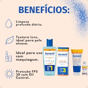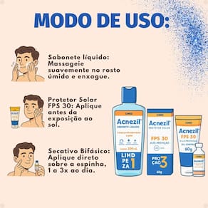 Composto por três produtos essenciais – Sabonete Líquido, Protetor Solar FPS 30 e Secativo Bifásico – o Kit Acnezil atua na limpeza profunda, proteção eficaz contra os raios UVA e tratamento direto das lesões, proporcionando resultados visíveis e uma pele equilibrada.