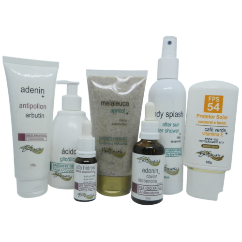 Kit Para Clareamento De Virilhas E Axilas Bioexotic Anvisa: Nº proc. 25351.051948/2015-18 Os 7 Produtos do Kit: 1 Sabonete Gel de Ácido Glicólico - 250ml 2. Sabonete Esfoliante de e Apricot - 150g 3. Gel Fluído Alfahidroxiácidos Ác. Cítrico e Ác. Glicólico , Ác. Fítico e Ác. Kójico - 15ml - Peeling Químico 4. Gel Fluido Facial com Adenin, Caviar e Idebenona - 50ml - Anioxidante - Ionizável 5. Loção Hidratante e Refrescante Body Splash - 240ml 6. Máscara Facial com Adenin, Antipollon e Arbutin - 120g - Clareadora 7. Protetor Solar FPS 54 com Vitamina E Toque Seco - 120g Serve também para qualquer mancha escura oriunda do processo de pós depilação com cera quente. Modo de usar: A. Higienizar a área c/ Sabonete de Ácido Glicólico, utilizando movimentos circulares, deixando agir por 5 minutos. Remover com algodão umedecido com água. B. Esfoliar com o Sabonete esfoliante de e Apricot esfregando com a ponta dos dedos para retirar as células mortas. Retirar o excesso com gaze umedecida. C. Aplicar Gel Fluído Facial Alfahidroxiácidos Ác. Cítrico e Ác. Glicólico , Ác. Fítico e Ác. Kójico. Deixar agir por 15 minutos e retirar com água ou gaze umedecida. D. Ionizar na polaridade + o Gel Fluido Facial com Adenin, Caviar e Idebenona ou simplesmente aplicar no local e deixar a pele absorver. E. Aplicar a Máscara Clareadora Facial com Adenin, Antipollon e Arbutin. Deixar agir por 20 minutos aproximadamente, retirar com gaze umedecida em água. F. Aplicar a Loção Hidratante e Refrescante Body Splash e deixar secar G. Aplicar o Filtro Solar Toque seco FPS 54. Observação: Iniciar o tratamento após uma semana da depilação. Aplicar o protocolo 1 vez por mês ou a critério da profissional. Descrição do acompanha: 1. Gel Corporal Massagem com Laranja Amarga e Mellilotus - 250g Gel para massagem poral, contendo princípios ativos que estimulam a circulação periférica, auxiliando na circulação de retorno e na drenagem de líquidos.