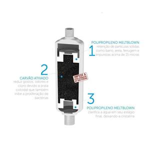 Esse refil também retém partículas como barro, areia, ferrugem e outras acima de 5 micras. Além disso, ele controla a proliferação de bactérias, garantindo uma água mais segura para o consumo.