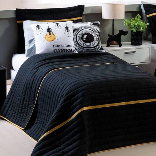 Kit Cobre Leito 4 Peças Solteiro Inove 100% Poliéster - Selfie Preto/mostarda Kit Cama Solteiro Inove 04 Peças Hipercal 200 Fios Dupla Face Inove na decoração do quarto com um kit completo e cheio de estilo! O Kit Inove foi criado para quem busca um visual moderno e divertido, combinando um cobre leito dupla face com almofadas temáticas para uma cama posta cheia de personalidade.