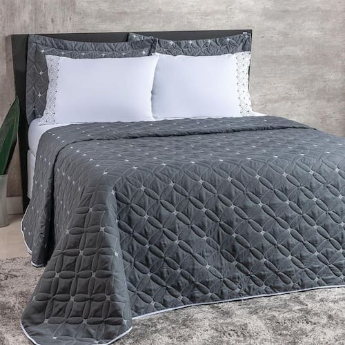Detalhes Bordados: O cobre leito, os porta travesseiros e as fronhas possuem um charmoso bordado, que enriquece as peças e confere um visual mais elegante ao conjunto.