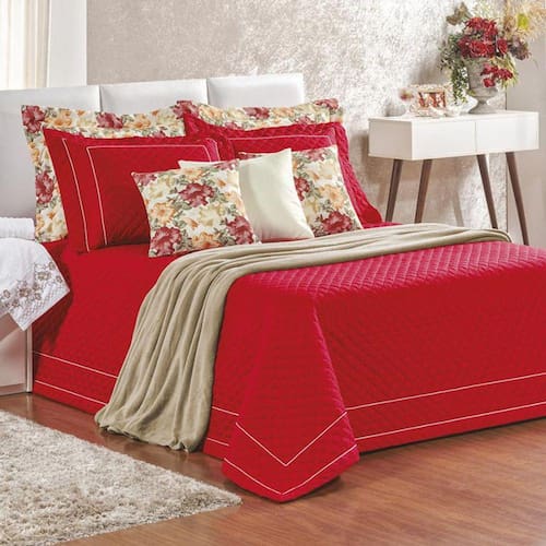 Nossa Loja vem para trazer o que há de melhor em produtos para sua roupa de cama, mesa e banho. Sempre preocupada em levar a maior qualidade de produtos e atendimento até você, nosso cliente.Kit Cobre Leito Amilca Casal King 5 Peças 180 Fios Delicado e Elegante. Composto por 1 cobre leito, 2 porta travesseiros e 2 refis de travesseiros.Kit Cobre Leito Casal King 5 Peças1 Cobre Leito 3,05m x 2,65m2 Porta Travesseiros 80cm x 60cm2 Refis de Travesseiros 75cm x 55cmComposto por:Tecido Externo Microfibra 180 FIOS 84g - 100% poliésterEnchimento - 100% poliésterRefil de Travesseiro:Tecido - 100% PolipropilenoEnchimento - 100% PoliésterComposição: 100% PoliésterCor: vermelhoTecido: 100% Poliéster 180 FiosTamanho: kit Casal KingFios: 180 FiosAs fotos são meramente ilustrativas. As cores podem variar de acordo com cada monitor e não representam todas as peças que compõem na foto do produto. Fique atento à descrição e o título do produto.