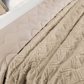 O acabamento em 3D no tecido é o detalhe que faz toda a diferença. Cada linha e textura criam uma profundidade visual que transforma o cobre-leito em uma verdadeira obra de arte têxtil.