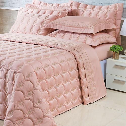 Kit Cobre Leito Colcha Garland Queen 100% Algodão 400 Fios Acetinado Bordado 5 Peças - Rosê E Fendi