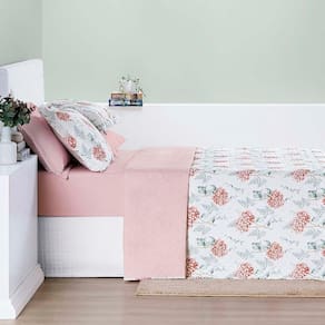 Transforme seu quarto em um refúgio de conforto com o Kit Cobre Leito Maggy, confeccionado em percale 200 fios que combina durabilidade e um toque suave para noites de sono revigorantes. Com uma face estampada em padrão floral e a outra lisa, este cobre leito oferece a opção de variação no visual, permitindo uma renovação no ambiente de forma prática.