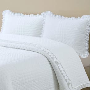 Seu design acolchoado matelado em padrão geométrico transmite sofisticação, enquanto os babados delicados nas bordas adicionam um toque clássico e romântico ao visual da sua cama. Além de decorar, o cobre leito é resistente, fácil de lavar e de secagem rápida, garantindo praticidade para o dia a dia.