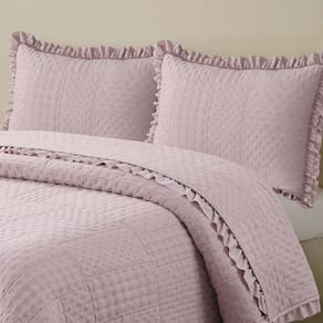 Seu design acolchoado matelado em padrão geométrico transmite sofisticação, enquanto os babados delicados nas bordas adicionam um toque clássico e romântico ao visual da sua cama. Além de decorar, o cobre leito é resistente, fácil de lavar e de secagem rápida, garantindo praticidade para o dia a dia.