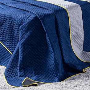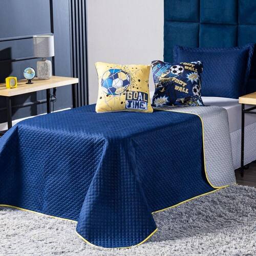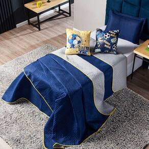 Confeccionado em tecido Microfibra Poliéster, a nova Coleção Futebol Goal vem trazendo um toque macio, com portas em acabamento debrum, o cobre leito com enchimento em manta dupla face, combinando cores modernas, permitindo o uso dos dois lados (Azul Marinho e Cinza), tudo para combinar com a sua decoração! Acompanhando duas lindas capas de almofadas estampadas digitais com zíper, facilitando a lavagem e o seu dia a dia para montar a cama do seu jeito! Produzido num rigoroso controle de qualidade, dando um toque de requinte para o ambiente. Confira!