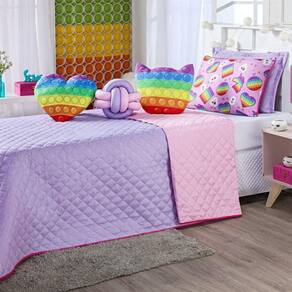 A Nova Coleção Infanto-Juvenil 2021 em Microfibra tem um toque suave e macio. O tecido caracteriza-se por ser muito leve, confortável, sedoso, com secagem rápida e ótimo caimento. Vem trazendo estilo para a decoração de seu quarto na nova tendência Dupla Face, podendo utilizar as 2 cores do cobre leito! Ficará de ótimo bom gosto e elegância. Acompanhando também as almofadinhas estampadas temáticas e uma de nó super moderna! Tudo para combinar com a decoração. Confira! Contém 01 Cobre Leito 2,15m X 1,60m 01 Porta Travesseiro Liso Matelado (Lilás) 70cm X 50cm 01 Porta Travesseiro Estampado 70cm x 50cm 01 Almofada Formato Gatinho Estampada 40cm x 35cm 01 Almofada Formato Coração Estampada 40cm x 40cm 01 Almofada de Nó (Tamanho aproximado de 30cm x 30cm) Composição: Tecido Superior: 100% Poliéster Microfibra Tecido Inferior: 100% Poliéster Microfibra Porta Travesseiro Liso Matelado Lilás: 100% Poliéster Microfibra Porta Travesseiro Estampado: 100% Poliéster Microfibra Enchimento: 100% Poliéster Composição Refil: Externo: 100% Polipropileno Enchimento: 100% Poliuretano Instruções de Uso e Lavagem: Vide etiqueta do produto. Foto meramente ilustrativa. Variação das cores podem ocorrer de acordo com o monitor.
