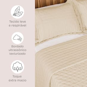 Com detalhes de bordado inglês nas laterais, e acabamento ultrassônico com textura em baixo-relevo, para deixar sua cama ainda mais charmosa. O tecido micro percal 100% poliéster, tem toque ultra macio, com aquela sensação gostosa de aconchego desde o primeiro uso.