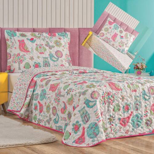 Kit Cobre Leito Solteiro e Lençol 4 Peças Corujinha - Rosa