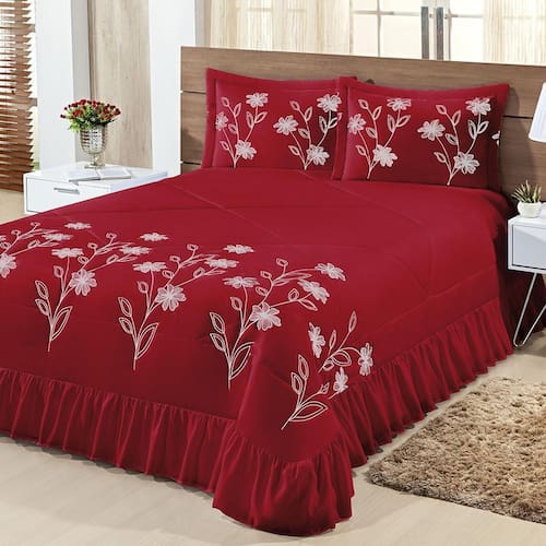 Kit Cobre Leito Casal Super King Lírio 03 Peças Colcha - Vermelho Contém:01 Cobre Leito 2,90m x 3,10m 02 Porta Travesseiros 70cm x 50cm Composição: Tecido Superior: 100% Poliéster Tecido Inferior: 50% Algodão e 50% Poliéster Enchimento: 100% Poliéster Informações:- Imagens meramente ilustrativas.- Pode haver alteração de cores de acordo com o seu monitor ou celular. Garantia contra defeitos de fabricaçãoMarca: Finos EnxovaisModelo: Lírio