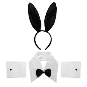 Conteúdo: 1 Kit de Adereços Coelhinha com Tiara com Orelhas, Gola com Gravata Borboleta e Punhos com Botões