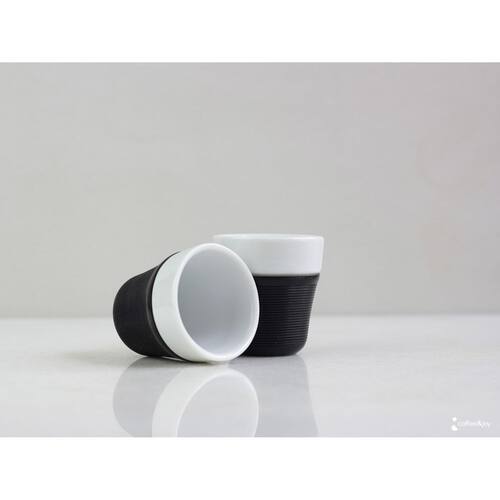 Os copos são produzidos em porcelana de alta qualidade com acabamento elegante e durável, e vêm com luvas de silicone que protegem as mãos do calor e garantem uma pegada confortável e segura. Essa combinação une estética e funcionalidade, tornando o kit perfeito tanto para uso diário quanto para servir espresso em ocasiões especiais.