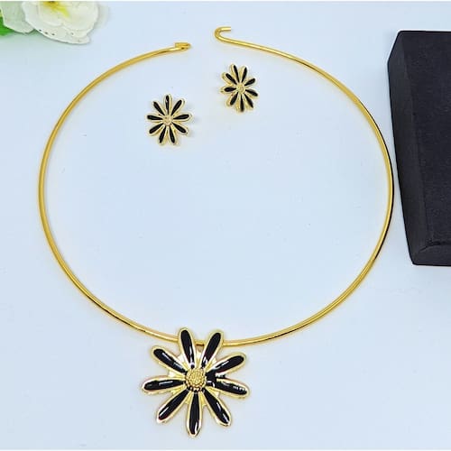 Kit Colar e Brincos Choker Aro Rígido com Pingente Flor margarida Verão Folheado Ouro Tendência Moda Luxo Lançamento