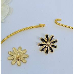 Colar aro dourado com detalhe circular pingente Flor Margarida resinada preto e branco folheado ouro