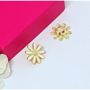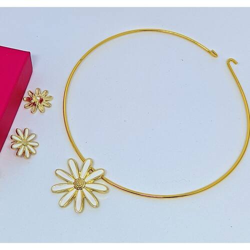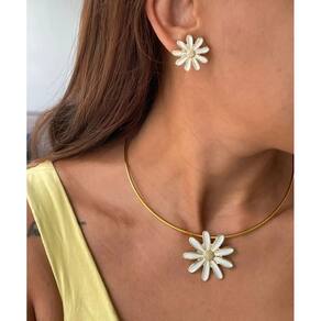 Kit Colar e Brincos Choker Aro Rígido com Pingente Flor margarida Verão Folheado Ouro Tendência Moda Luxo Lançamento