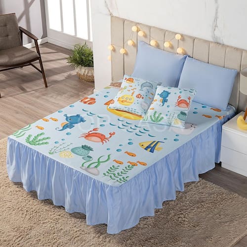 Kit Colcha Cobre Leito Casal 5 peças Estampados Infantil Quarto Fundo Do Mar Colcha temática com estampa digital, de alta qualidade, levando charme e Durabilidade para o quarto. Descrição produto: 01 - Colcha : 2,60 x 2,70 Com Babado e Bainha 02- Fronha : 50 x 70 02- Capa de Almofada : 45x 45 Modelo Envelope Composição :100% Poliéster Tecido: Poliéster 160 Fios Sobre este item Excelente custo benefício FABRICAÇÃO PROPRIA.