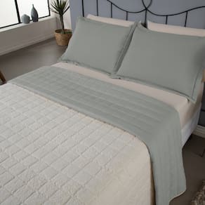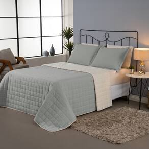 Com design clean e acabamento em matelassê, garante que as peças sejam extremamente resistentes e dão ainda mais conforto ao toque. O cobre leito tem dupla face, de um lado confeccionado em tecido percal 180 fios e do outro sherpa pele de carneiro, que concede uma textura agradável em contato com a pele e maior conforto para o seu sono.