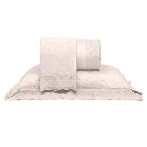 Kit Colcha Queen Cristal com Renda Luisa 300 Fios Buettner Cor: Marfim Kit Colcha Queen Cristal com Renda 300 Fios Buettner Confeccionado em percal 300 fios de alta qualidade, apresenta uma textura suave e luxuosa, proporcionando uma sensação agradável ao toque. O detalhe da renda Luisa é o que o torna verdadeiramente excepcional. A combinação perfeita entre a sutileza da renda e a suavidade do algodão cria uma harmonia visual encantadora, capaz de transformar qualquer ambiente. Além da sua beleza estética, a durabilidade e a resistência são características marcantes deste produto. A qualidade dos materiais utilizados e o cuidado na sua fabricação garantem uma peça que irá perdurar por muitos anos, mantendo-se bela e impecável mesmo após múltiplas lavagens. contém:1 Colcha em Matelasse 2,50m x 2,80m2 Porta Travesseiros com aplicação de renda 50cm x 70cm Material: 100% Algodão - Percal 300 FiosEstampa: LuisaMarca: Buettner