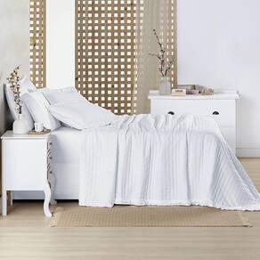 Kit Cobre Leito Colcha Vitta King Matelado com Babadinhos 200 Fios 3 Peças Branco Produzida em Micropercal 200 fios, oferece um toque extremamente macio e suave, garantindo conforto em todas as estações. Seu matelado ultrassônico proporciona acabamento elegante, moderno e resistente, sem linhas de costura aparentes.
