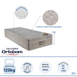Kit Colchão Ortobom Airtech Solteiro + Base Box + Protetor O Kit é composto por colchão Airtech, base box Blindada e protetor de colchão Impermeável . Colchão Ortobom Airtech – 88x188x25 cm Tipo de molas: ensacadas individualmente Camada de espuma D26. Placa de EPS que contribui para estabilidade. Revestimento em tecido jacquard com viscose. Sistema No Turn (giro sem necessidade de virar). Tratamentos: antiácaro e antialérgico. Suporte de peso: até 120 kg 2. Base Box Blindada Click – 88x188 Estrutura em madeira de pinus. Revestimento em tecido suede. Altura com pés: 40 cm / sem pés: 27 cm. Suporte de peso: até 150 kg Pés inclusos, instalação por encaixe. 3. Protetor de Colchão Impermeável Ortobom – 88x188 Material: malha 100% poliéster com aplicação de PU. Impermeável e respirável. Tratamentos: antiácaro e antifungo. Fixação com elástico em formato de lençol. Observações Importantes Antes da compra, confira as dimensões do produto e verifique se ele passa por portas, corredores e elevadores do local de entrega.