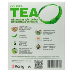 Kit Coleira Contra Pulgas E Carrapatos Tea 327 Cães De Porte Médio Knig 28G Com 44Cm Com 5 Unidades O Kit contém: 5 Coleiras Contra Pulgas E Carrapatos TEA 327 Cães De Porte Médio Knig 28g com 44cm As coleiras da linha TEA são atóxicas e ideais para a prevenção da infestação de pulgas e carrapatos. Prevenção e controle de pulgas e carrapatos que infestam Cães. Contêm uma matriz plástica exclusiva, que libera de forma contínua micropartículas sob a forma de pó, não deixando o pêlo do animal engordurado. Possuem efeito preventivo por até 5 meses contra as reinfestações por pulgas e carrapatos. Composição: Cada 100 g contém: Propoxur. 10,00g ; Excipiente .S.P. 100,00g Modo de uso: Colocar a coleira no pescoço do animal tendo o cuidado de deixar espaço suficiente para permitir a passagem de dois dedos por debaixo da mesma. Cortar e descartar a parte excedente. Verificar periodicamente o ajuste da coleira, especialmente em animais em crescimento. Retirar a coleira antes do banho e voltar a colocá-la quando o pêlo estiver seco. IMAGENS MERAMENTE ILUSTRATIVAS Marca: Não Informado
