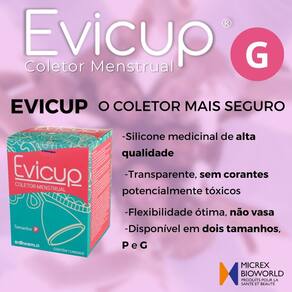 Kit Coletor Menstrual EVICUP G + Caixinha para esterilizar e guardar o coletor Kit Coletor Menstrual Evicup G + Caixinha Esterilizadora Evicup é um coletor menstrual fabricado com a mais alta qualidade de silicone medicinal sem corante em 2 tamanhos; Ginecologicamente testado. Destinado a recolher os fluxos menstruais, substituindo assim os absorventes descartáveis. Feito para a vida cotidiana, bem como a prática de todos os tipos de esportes, além de poder ser utilizado durante a noite de sono, sem se preocupar com vazamentos. Indicado para todas as faixas etárias, inclusive mulheres que utilizando contraceptivo do tipo DIU Mais prático, saudável, higiênico, confortável e ecologicamente sustentável, além de ser muito econômico, pois um Evicup pode ser por até 5 anos. Feito com silicone medicinal, totalmente antialérgico e seguro. O Tamanho G grande é recomendado para mulheres com mais de 30 anos ou que já tem filhos. O Tamanho P Pequeno é recomendado para mulheres com menos de 30 anos e que não tem filhos bem como para adolescentes, dependendo do tipo corporal. Toda vez que for removido e esvaziado, é recomendado a higienização do coletor menstrual com água e sabão, antes de reintroduzi-lo. Também é recomendado esterilizar o coletor menstrual antes do primeiro uso e após o final de cada ciclo de utilização, utilizando a Caixinha Esterilizadora Micrex-BioWorld. Totalmente destinada a esterilizar os copos menstruais no micro-ondas, trazendo mais praticidade e segurança comparado a esterilização feita no fogão. Feito com material próprio polipropileno para utilização no micro-ondas Advertências: - Este produto não é contraceptivo e não pode ser como tal. - Mulheres com prolapso, retroversão ou ante-flexão do útero, deve consultar um médico antes de iniciar o uso do coletor menstrual. - O coletor menstrual foi desenvolvido para atender a todas as faixas etárias das mulheres, entretanto aconselhamos que consulte seu médico ginecologista antes de iniciar o uso, principalmente nos seguintes casos: mulheres que ainda não tiveram a sua vida sexual iniciada, mulheres que utilizam algum tipo de contraceptivo interno ex.: DIU , e mulheres que estão no período pós-parto. - Caso houver dificuldades para remoção do coletor menstrual, procurar ajuda médica o mais rápido possível. - Os coletores menstruais podem estar associados com a Síndrome do Choque Tóxico SCT . Conservação: Temperatura ambiente