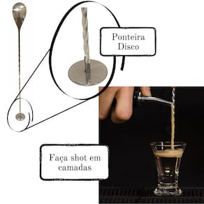 Kit colher bailarina 27cm + dosador duplo inox gin coquetel kit contendo 1 colher bailarina ponteira disco de 27cm e 1 dosador duplo 25/50ml em inox. - informações da colher bailarina: este modelo de colher é ideal para o preparo de drinks e coquetéis sem risco de contato com o líquido e também para trazer charme e elegância na técnica de preparo. Além de ter todas as vantagens de uma colher tradicional, ela dispõe de um disco na ponta que auxilia no preparo de coquetéis em camadas, e pode ser utilizado para macerar folhas leves como hortelã, etc. Além de misturar as bebidas em copos profundos, tem seu corpo alongado com espiral para facilitar o preparo de drinks em camadas ou derramar líquidos gasosos em menor velocidade. - informações do dosador duplo: considerado um dos mais importantes e utilizados acessórios para coquetéis, o dosador duplo modelo americano em inox é perfeito para facilitar o preparo de diversos drinks, pois auxilia na utilização exata de cada ingrediente, facilitando a padronização das receitas. Por conter duas medidas: 25ml e 50ml , é ideal para evitar excessos e deixar seus drinks muito mais saborosos. Especificação técnica: - material: aço inox - comprimento da colher: 27cm - modelo: bailarina com ponteira disco. - volumes do dosador: 25/50ml