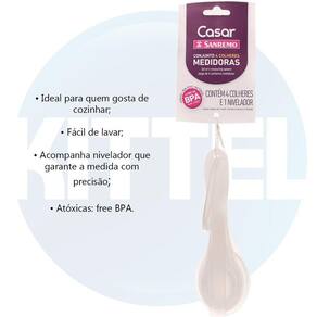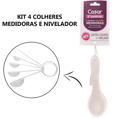 Kit colher medidora plástico atóxico 4 cl nivelador sanremo jogo 4 colheres medidoras + nivelador plástico sanremo O conjunto de colheres medidoras com 5 peças da sanremo é feito para você acertar nas receitas e não passar das medidas. São quatro colheres e um nivelador que alinha o conteúdo e indica a medida com precisão. Esse kit não pode faltar na cozinha de quem adora uma receita ou então de quem trabalha com gastronomia e além de tudo, é fácil de lavar Conjunto de colheres medidoras plásticas sanremo. 1 colher 15ml 1 cl sopa . 1 colher 7,5ml cl sopa . 1 colher 5ml 1 cl chá . 1 colher 2,5ml cl chá . 1 nivelador. Garanta já seu kit