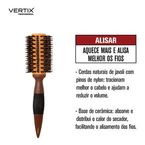 Escova redonda de madeira com base de cerâmica e cerdas naturais de javali intercaladas com pinos de nylon. A base de cerâmica retém o calor do secador por mais tempo, além de distribui-lo mais uniformemente. As cerdas e pinos proporcionam a tração ideal para cabelos mais volumosos e difíceis de penetrar.