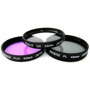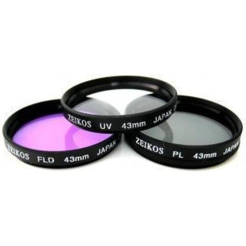 Zeikos 43mm glass multi coated 3 piece filter kit consisting of an ultra violet uv , circular polarizer cpl , and a fluorescent fld filter. They have black metal rings to match most cameras. A hard, protective case is included.
