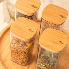 Descrição do Produto: Ideal para organizar temperos e pequenos ingredientes, o Kit com 04 Potes Herméticos Keep 340ml proporciona praticidade e cuidado para o seu dia a dia. A coloração dos potes protege os alimentos da luz, garantindo frescor e qualidade prolongados. A tampa de bambu sustentável, além de charmosa, mantém uma vedação hermética, preservando o aroma e a qualidade dos temperos por mais tempo. Com design modular, esses potes tornam o ambiente mais harmonioso e a organização muito mais fácil.