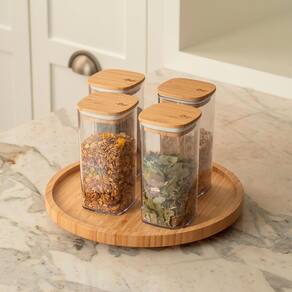 04 Potes Herméticos Keep 340ml Altura: 13,5 cm, Largura: 6,5 cm, Profundidade: 6,5 cm Material: Poliestireno + Bambu Capacidade: 340 ml