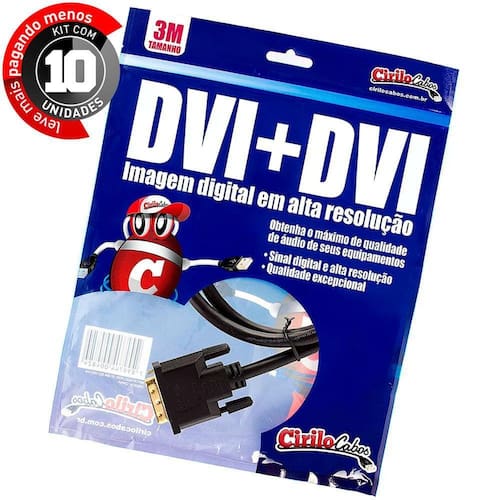 Kit Com 10 Cabos Dvi Para Dvi, 3 Metros - Cirilo Cabos Desenvolvido agora pela Cirilo Cabos, o Cabo DVI-D para DVI-D Dual Link 25 pinos de 3 metros, conta com pontas banhadas em ouro para que você possa transmitir imagens de tirar o fôlego com resolução de até 2560 x 1600 em HD digital. Esse cabo é bastante utilizado para conectar Placas de Vídeos em Monitores LCD, TVs LCD e projetores digitais.