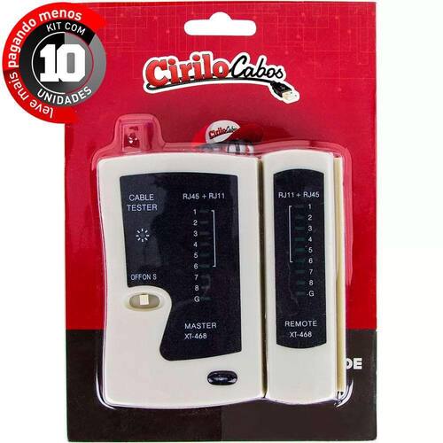 Kit Com 10 Testes De Rede Rj45 Rj 11 Crimpagem Cabo Rede O kit com 10 Testadores de Cabo de Rede RJ-45 e RJ-11 da Cirilo Cabos é uma excelente escolha para quem precisa testar os cabos de rede RJ-45 e telefone RJ-11 com precisão. Ideal para quem trabalha com instalaçoes de cabos no dia a dia e precisa realizar testes constantes. Como utilizar É bem fácil utilizar o Testador de Cabo de Rede, basta conectar um ponta do cabo no terminal de teste máster e a outra no terminal remoto Remote , o terminal de teste irá enviar um sinal, o qual deve apresentar a mesma sequência no visor do testador máster e do terminal remoto remote , lembrando que para seguir a mesma sequência o cabo precisa estar crimprado de forma correta. Para Testar e Certificar Cabos de Rede Fácil Utilização Resultados Rápidos e Precisos Design Compacto Especificações Técnicas: Marca: Cirilo Cabos Modelo: XT-468 Plugs compatíveis: RJ45 e RJ11 Cabos: CAT-5 e CAT-6 Alimentação: Bateria 9V Não acompanha o produto Acompanha: 10 Testadores de Cabo de Rede RJ45 e RJ11 Peso Individual: 0,125g Peso do Kit: 1.250g Dimensões do Produto: A x L x C : 10,2 x 2.8 x 10 cm. Garantia: 3 meses