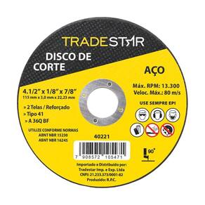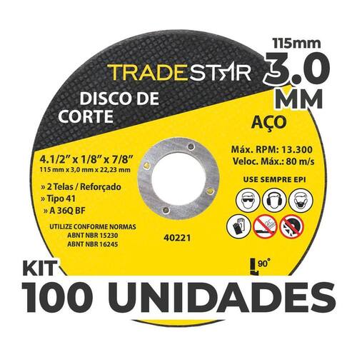 Kit com 100 Unidades Disco de Corte Metal 115x3,0 mm Furo 22/23 mm O Disco de Corte Metal 115x3,0 mm com Furo 22/23 mm, a escolha definitiva para profissionais que buscam potência e durabilidade no corte de metais. Com um diâmetro de 115mm e uma espessura de 3,0mm, este disco oferece cortes precisos e eficientes em uma ampla variedade de materiais metálicos. Principais Características e Aplicações: Corte Eficiente: Execute cortes rápidos e precisos em metais diversos, desde ferro até aço resistente. Indústria e Construção: Indispensável para projetos industriais, construção civil e manutenção. Como Obter Resultados Excepcionais: Preparação Adequada: Assegure que o material esteja firmemente fixado e seguro antes de iniciar o corte. Ferramenta Apropriada: Utilize o disco em uma esmerilhadeira angular com o furo de tamanho compatível. Movimentos Controlados: Mantenha a esmerilhadeira em um ângulo adequado e faça movimentos suaves para um corte uniforme. Benefício Central do Disco de Corte Metal: Potência e Durabilidade: O Disco de Corte Metal 115x3,0 mm com Furo 22/23 mm é a ferramenta essencial para profissionais que buscam cortes precisos e eficientes, garantindo resultados excepcionais em cada projeto. Disco De Corte Para Aços Indicado Para Corte De Aços. 2 Telas/Reforçado. Tamanho: 4.1/2 115 Mm Espessura: 3,0 Mm Furo: 22,23 Mm Quantidade por embalagem - 100 unidades Garantia 90 dias após a compra. Imagens meramente ilustrativas As tonalidades da cor do produto podem sofrer alterações de acordo com a tela que estiver usando para visualização. Vantagens de Comprar com a JJC Ferramentas: Experiência e Confiança: Somos especialistas em ferramentas e acessórios, garantindo produtos de qualidade e desempenho superior. Variedade e Qualidade: Oferecemos uma seleção abrangente de ferramentas, sempre priorizando a durabilidade e eficiência. Atendimento Personalizado: Nossa equipe está pronta para ajudá-lo, oferecendo suporte técnico e orientações precisas. Entrega Rápida: Garantimos uma logística eficiente, assegurando que seu pedido chegue no menor tempo possível. Satisfação Garantida: Se por algum motivo não ficar satisfeito, oferecemos política de devolução sem complicações. Marca: Tradestar Ean: 7898751383922