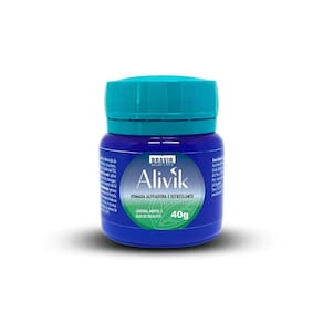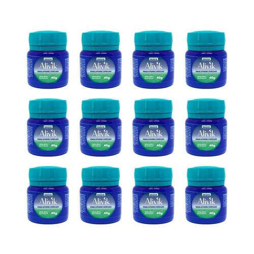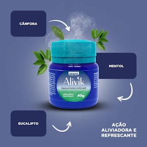 Kit com 12 bravir alivik 40g Kit com 12 unidades de alivik 40g Alivik 40g é uma pomada de ação aliviadora e refrescante. Contém cânfora, mentol e óleo de eucalipto. Também promove a diminuição da sensação de cansaço e das tensões musculares. Ean: 7898838101180