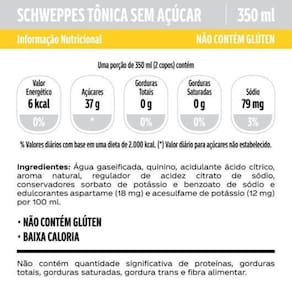 Produto: Kit com 12 unidades de Água Tônica SCHWEPPES Sem Açúcar 350ml. Ingredientes: Água gaseificada, quinino, acidulante ácido cítrico, aroma natural, conservador benzoato de sódio. Marca: SCHWEPPES. Origem: Brasil. Conservação: Armazenar em local fresco e seco. Após aberto, consumir imediatamente. Validade: Consultar embalagem.