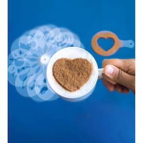 Para bebidas basta apoiar o stancils escolhido na caneca, xícara ou copo e salpicar chocolate em pó ou canela.