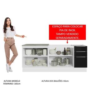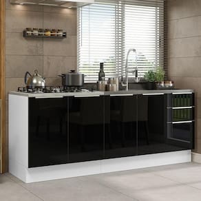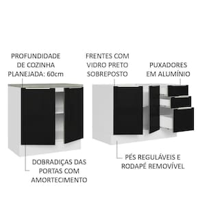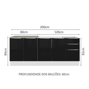 O balcão maior possui 120 cm de largura, com duas portas e três gavetas. Além disso, possui espaço para colocação de pia de inox ou pedra, na medida de 120 x ;60 cm. O outro balcão possui 80 cm de largura, conta com duas portas e o tampo pode ser recortado para instalação de cooktop.