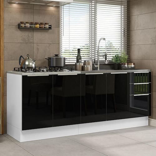 O acabamento da estrutura é em amadeirado Rustic e as portas e frentes das gavetas são pretas. É feito em Pintura Poliéster ecológica, com 7 camadas que protegem o móvel dos efeitos do álcool da água e do calor.