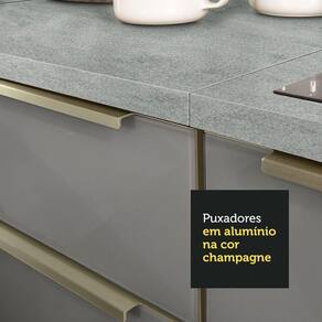 O acabamento da estrutura é branco e o das portas e frentes das gavetas é cinza. É feito em Pintura Poliéster ecológica, com 7 camadas que protegem o móvel dos efeitos do álcool da água e do calor.