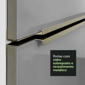 Um grande destaque são as portas e gavetas, que recebem um vidro cinza aplicado e revestimento metálico nas bordas, diferenciais que trazem muita elegância ao seu ambiente.