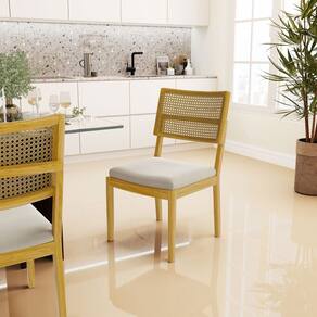 Apresentamos a você as cadeiras Milena, estruturadas em madeira maciça na cor castanho com telinha nos encostos, assentos estofados com espuma D-23.